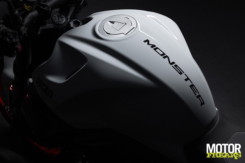 Het design van de nieuwe Monster is een frisse interpretatie van de klassieke lijnen, maar met een moderne twist. De compacte, sportieve vormen verwijzen naar het eerste model van 1992, met de kenmerkende bison-back tank, korte, lichte achterkant en het enkele zadel. Het front wordt gedomineerd door een full-LED koplamp met dubbele ‘C’-vorm en twee uitgesneden zijstukken die een subtiele knipoog geven naar de Panigale V4. De ergonomie is verbeterd met een 5 mm lager zadel (815 mm), waardoor rijders gemakkelijker bij de grond kunnen en het warme lucht van de radiator wordt efficiënt weggevoerd voor meer comfort.