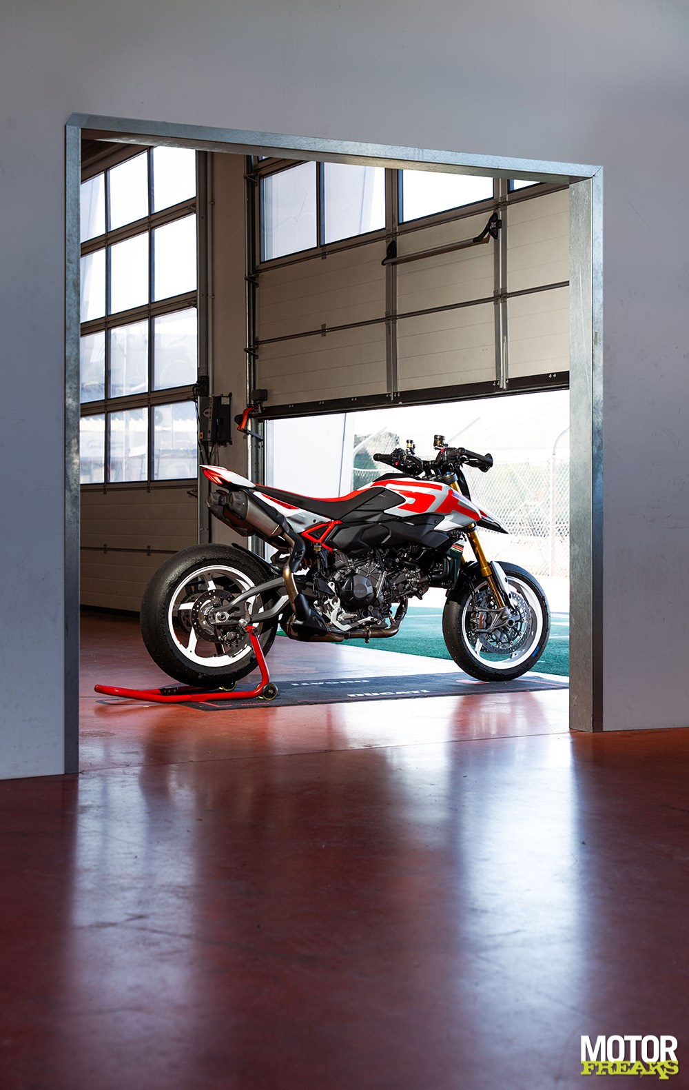 Een van de grootste stappen zit in het chassis. De Hypermotard V2 krijgt een compleet nieuwe aluminium monocoque die tevens dienstdoet als airbox. Dat zorgt voor een extreem compacte bouw, maar ook voor meer stijfheid. Samen met het nieuwe blok resulteert dat in een gewichtsbesparing van 13 kilo ten opzichte van de 950.