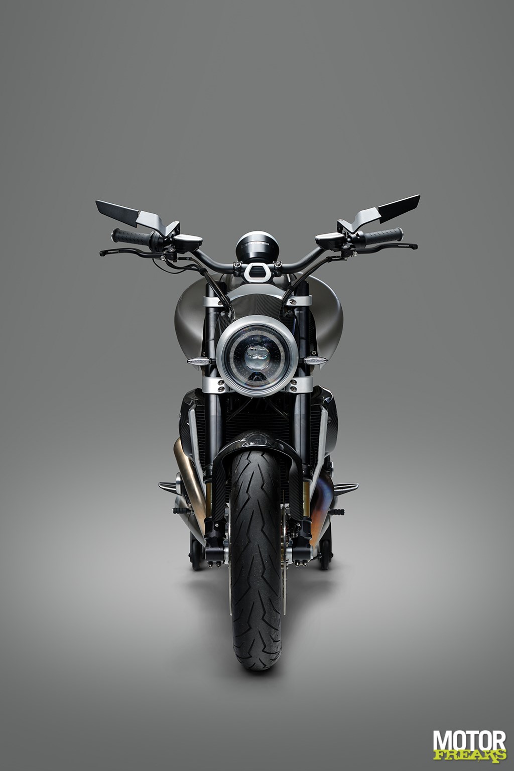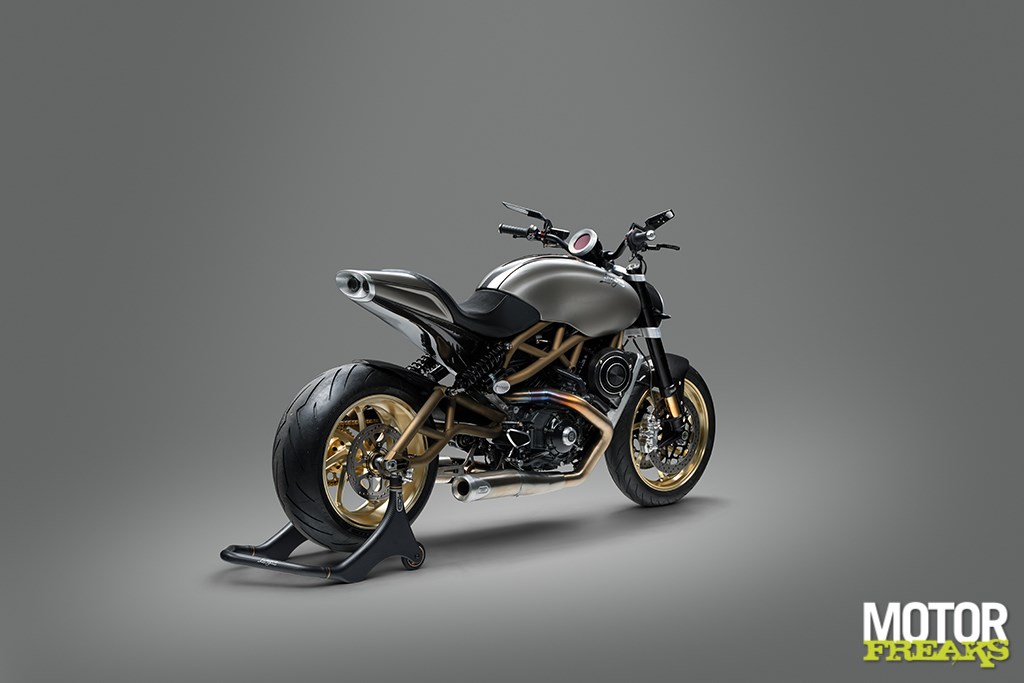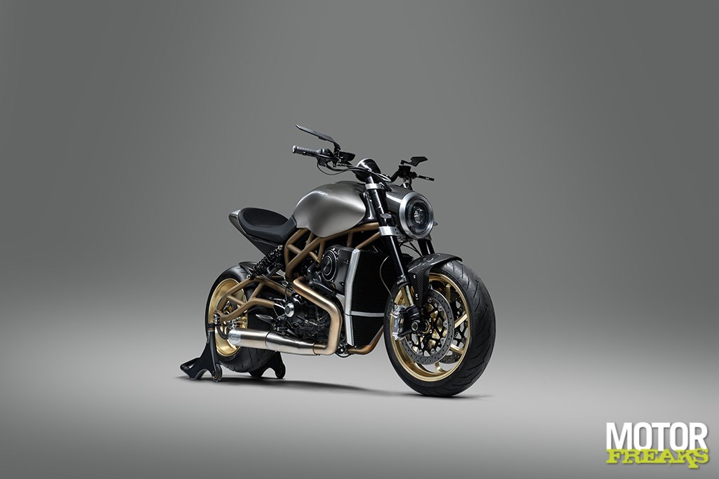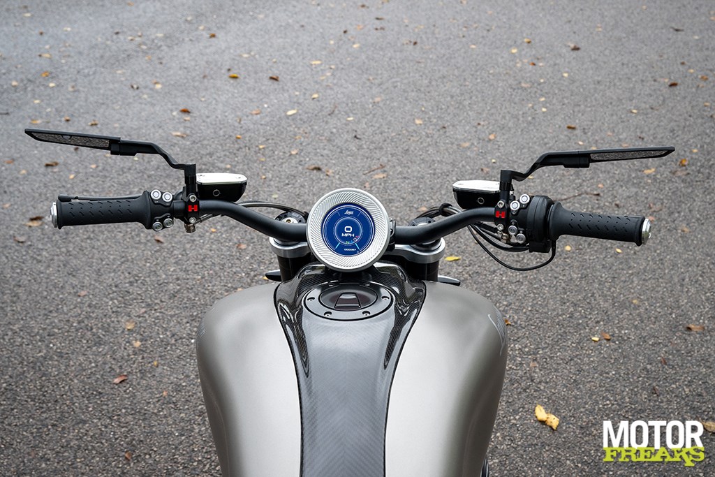 Langen’s eigen prachtig gemaakte 17-inch gesmede aluminium wielen, CNC-gefreesd in eigen huis, zijn voorzien van Pirelli Diablo Rosso III-banden, met een brede 6,00 inch achtervelg en een indrukwekkende 240/45-band. Zithoogte is 790 mm en het CNC-gefreesde ronde TFT-dashboard beschikt over een touchscreen en switchcube-interface. De minimalistische carrosserie is volledig van carbon fiber V-Weave, inclusief de grote kap over de 19-liter metalen brandstoftank.