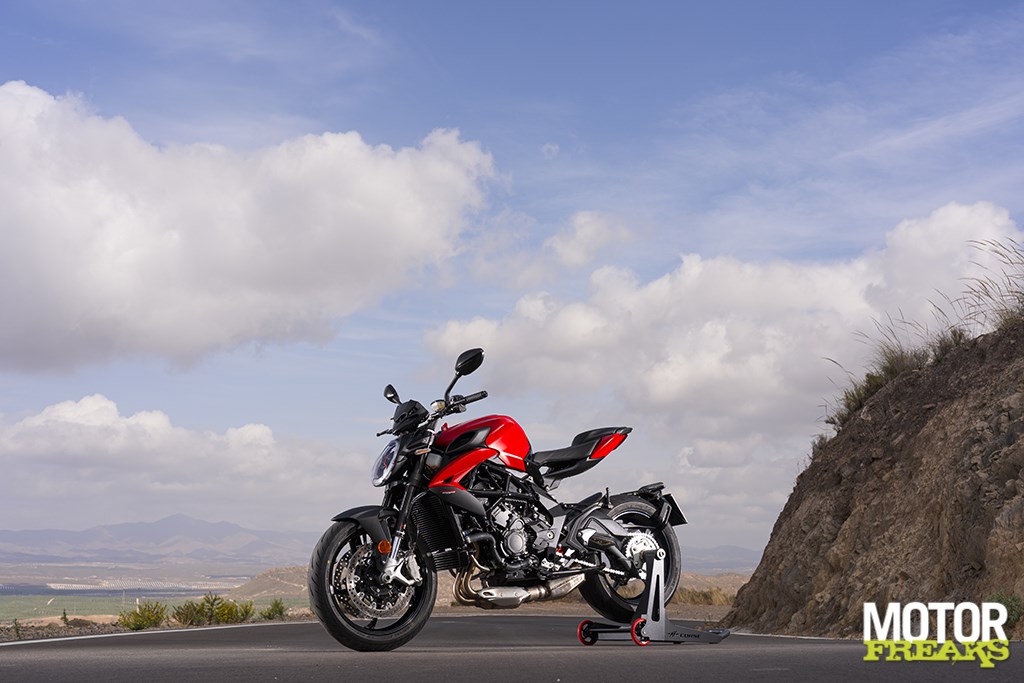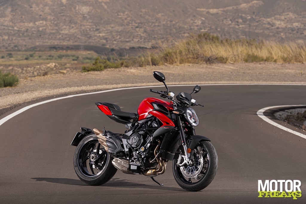 Op Bridgestone S22’s (120/70 en 180/55) voelt de Brutale zich thuis op zowel bochtige binnenwegen als snelle circuits.