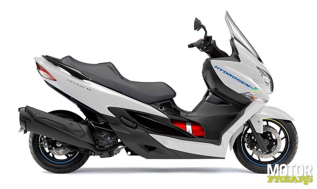 Naast de e-VanVan onderstreept Suzuki duurzaamheid met een waterstof aangedreven Burgman. Het opengewerkte model laat zien hoe een traditionele verbrandingsmotor kan functioneren op waterstof, met minimale milieu-impact, maar het typische motorgeluid blijft behouden.