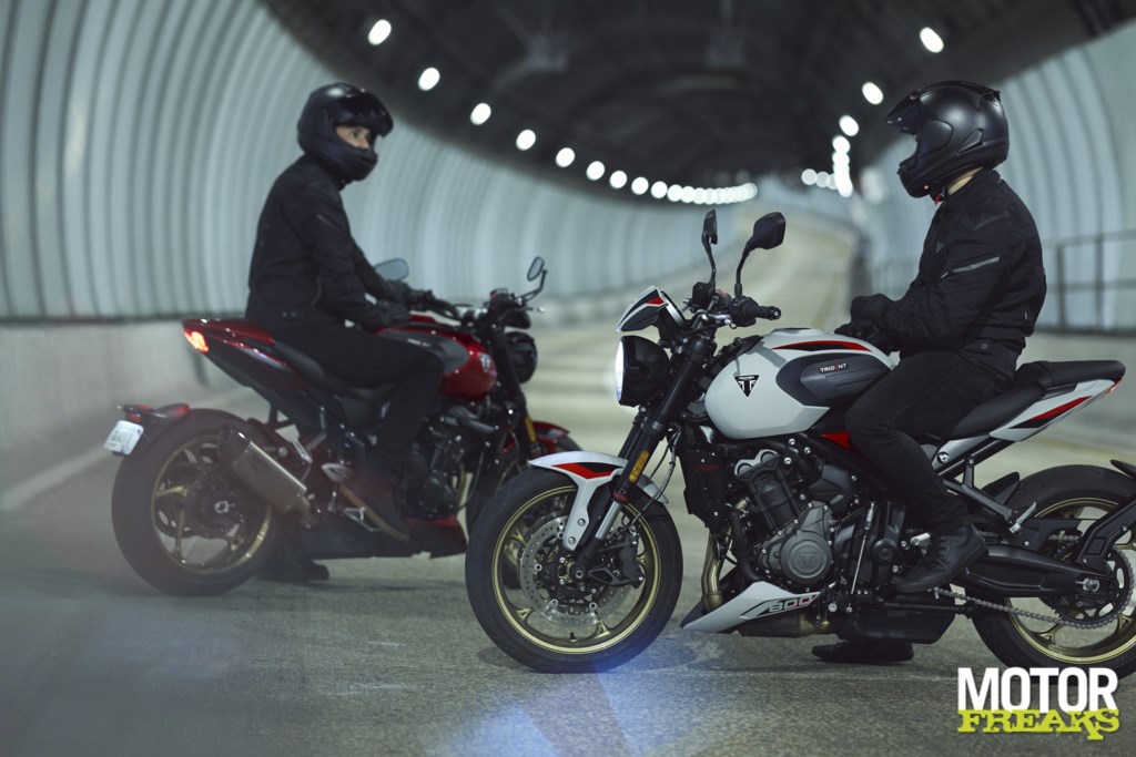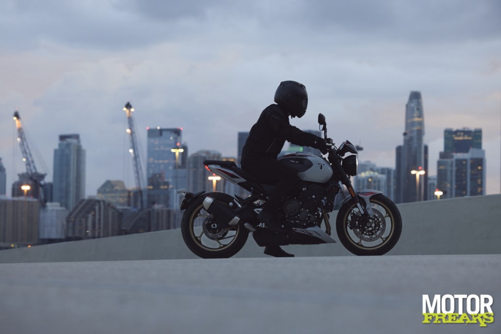 De zesbak laat zich ondersteunen door Triumph Shift Assist, waardoor op- en terugschakelen zonder koppeling mogelijk is. Ook cruisecontrole is standaard, een opvallende toevoeging in dit segment. Het volledige LED-pakket – van de ronde DRL-koplamp tot de geïntegreerde richtingaanwijzers – zorgt voor een moderne uitstraling met klassieke Triumph-signatuur.