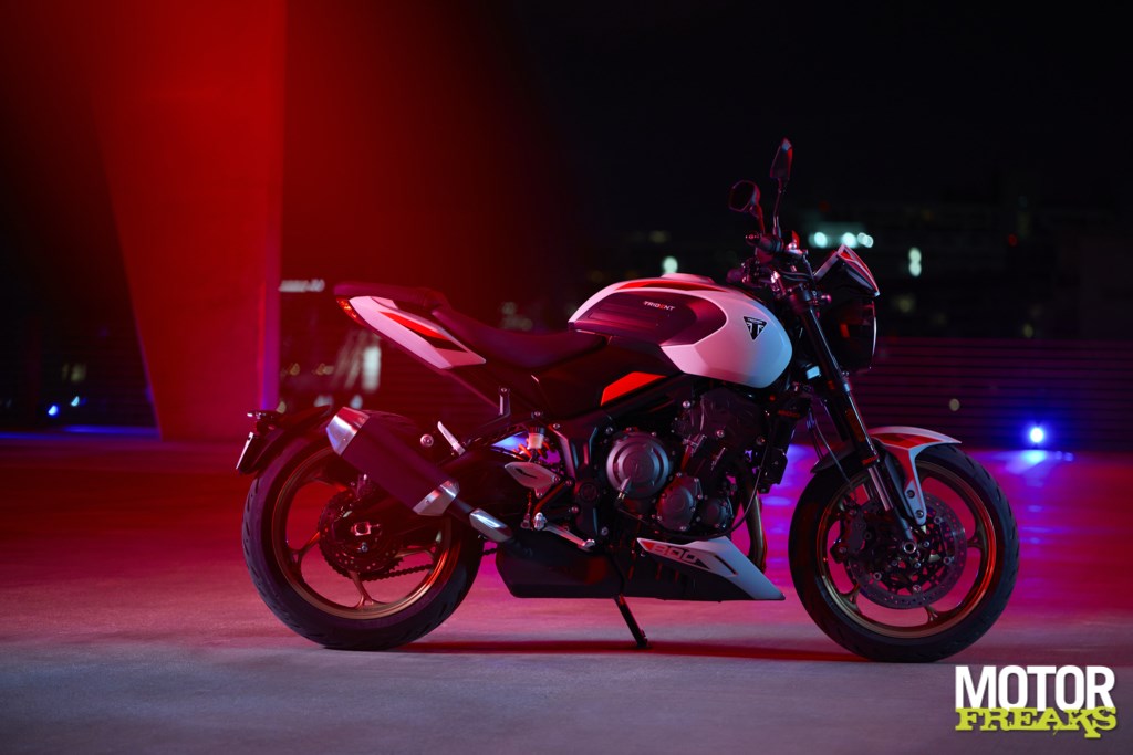Centraal in het verhaal staat de gloednieuwe 798cc-driecilinder met zijn opvallende drievoudige gasklephuizen. Triumph benadrukt dat de keuze voor dit concept niet alleen is ingegeven door prestaties, maar vooral door beleving: directe gasreactie onderin, een stevig koppelplateau in het midden en een eindschot dat tot ver voorbij de 10.000 toeren doortrekt.