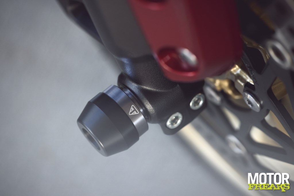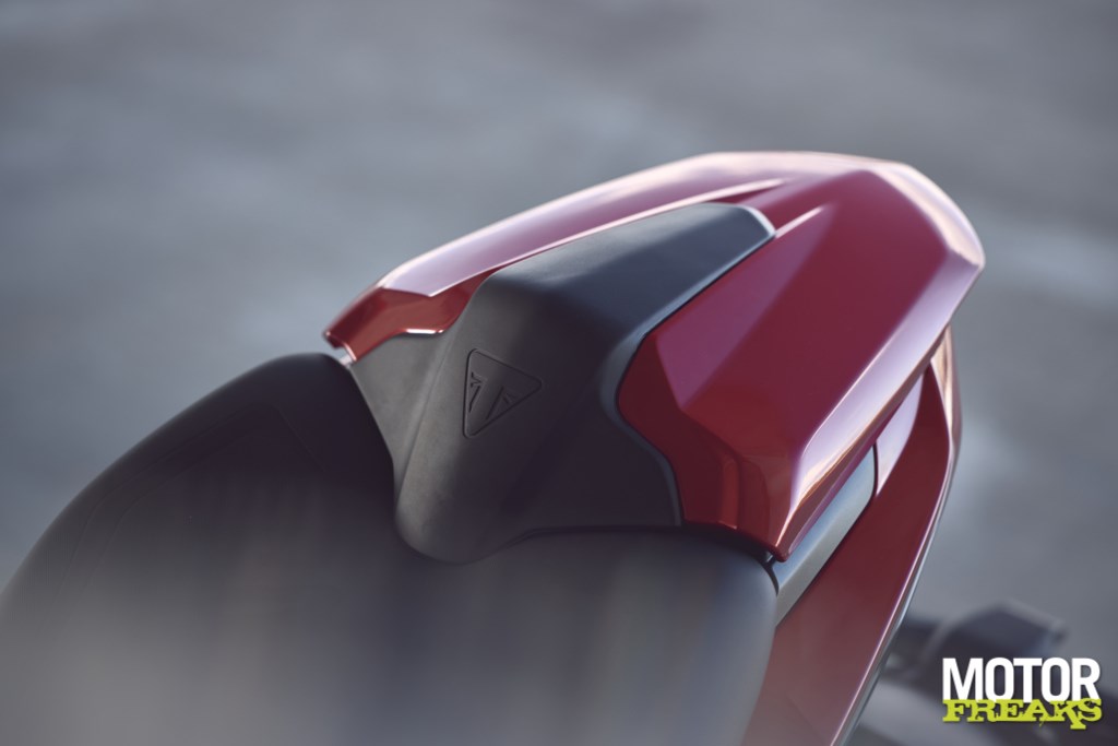 Triumph heeft zichtbaar aandacht besteed aan de afwerking: een reliëflogo in het zadel, aluminium accenten en goudkleurige lichtgewicht wielen voor dat tikje bravoure. De motor verschijnt in drie kleurstellingen: