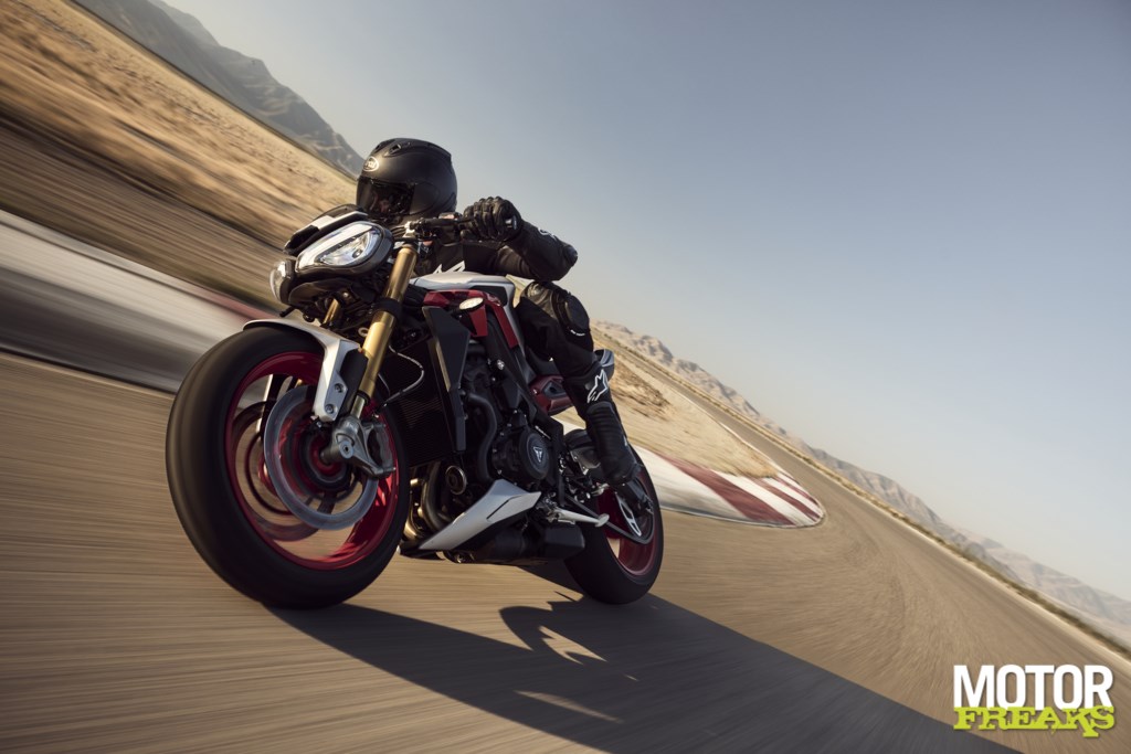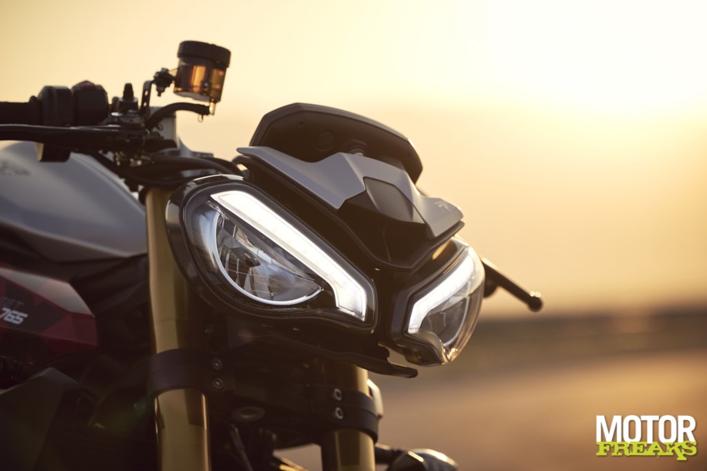 Onder de tank blijft de 765cc-driecilinder met 130 pk en 80 Nm trouw aan het RS-blok, dat hoogtoerig, responsief en perfect uitgebalanceerd is. Triumphs racedata uit Moto2 hebben geleid tot verdere verfijningen, zowel in duurzaamheid als in gasrespons. Elektronische assistentie zoals Track-ABS, geoptimaliseerde traction control en Triumph Shift Assist maken het mogelijk om zowel op het circuit als op de weg op maximale prestaties te vertrouwen.