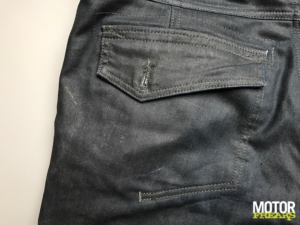 Ook het denim stof heeft de klap aardig overleefd. De impact met de rots is in het kniestuk duidelijk zichtbaar, maar meer dan dat is eigenlijk niet aan de broek te zien. Ook op de linkerdij zijn amper schaafplekken te zien. Nu moet ik daar wel bij aantekenen dat er van glijden niet echt sprake is geweest, met de klap tegen de rots was de snelheid er in een… klap wel aardig uit. Voor extra slijtvastheid heeft de Jean D30 Grey – net als de meeste motorjeans – aan de binnenkant van een kevlar (Aramid Fiber om precies te zijn) voering op die plekken waar het nodig is: het zitvlak, de heupen en de knieën. Daarnaast zijn de delen op de broek die gevoelig voor scheuren tijdens een crahs zijn, 3 of 4x doorgestikt.
