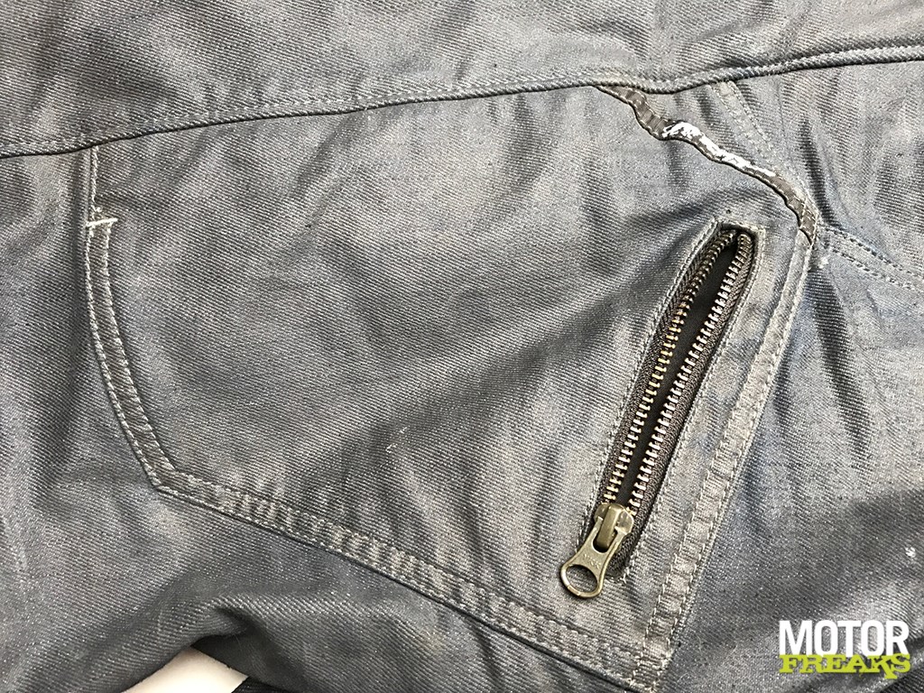Naast dat we nu dus weten dat de Furygan Jean D30 Grey een ontzettend veilige motorbroek is, scoort de broek ook ontzettend hoog op het vlak van comfort. Aan de bovenkant van het rechter bovenbeen is een opbergvak met ritssluiting aangebracht, waar precies een iPhone 7 in past, terwijl de broekzakken van een flap met knoopsluiting zijn voorzien, zodat niet ongewild je portemonnee uit je broekzak trilt. De broekzakken zijn trouwens niet, zoals bij de meeste spijkerbroeken, erop genaaid, maar inwendig aangebracht. Een ander enorm pluspunt is dat de denim ietwat elastisch is, waardoor ondanks de rechte, strakke snit de broek over motorlaarzen kan worden gedragen, d’r zijn genoeg motorjeans waar dat net niet bij lukt.