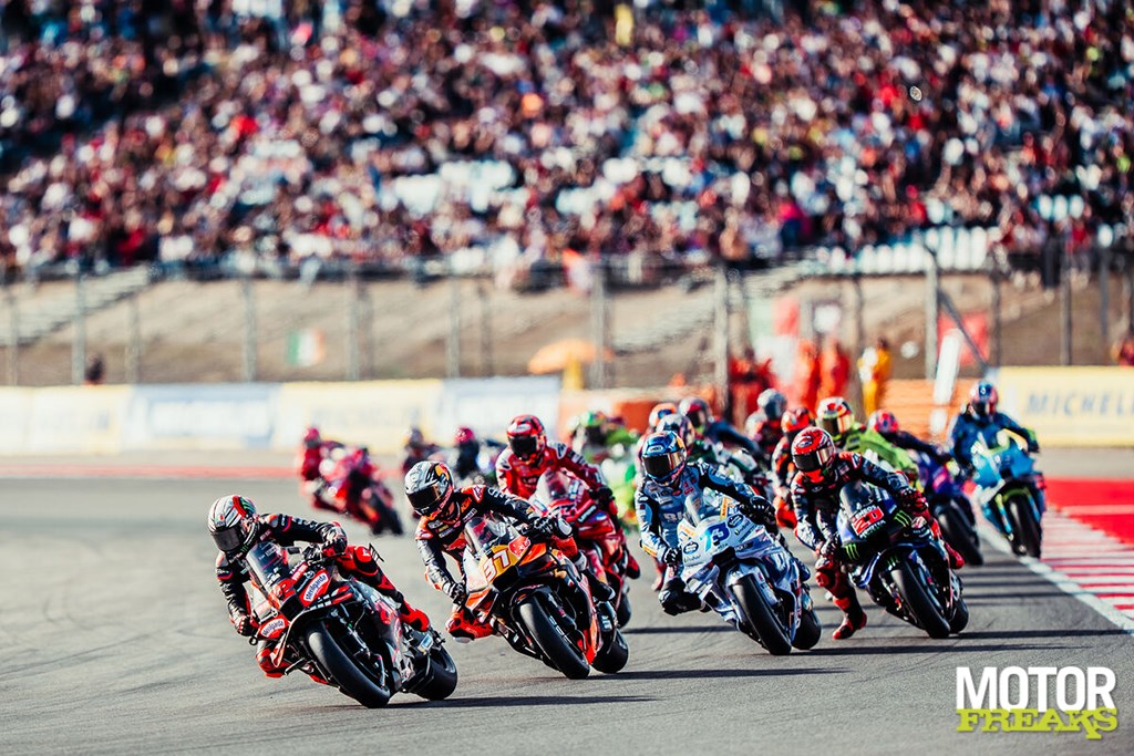 Na de waanzinnig spektaculaire Sprint van zaterdag, waarin de strijd om de winst tot de laatste bocht duurde, was de Grand Prix van zondag een totaal ander verhaal. Had het een dag eerder tussen Pedro Acosta en Alex Marquez nog vuurwerk geregend, was er ditmaal geen sprake van spanning aan de kop. Bezzecchi reed op zijn Aprilia RS-GP in eigen tempo weg en liet niemand ook maar een moment hopen op een duel om de leiding.