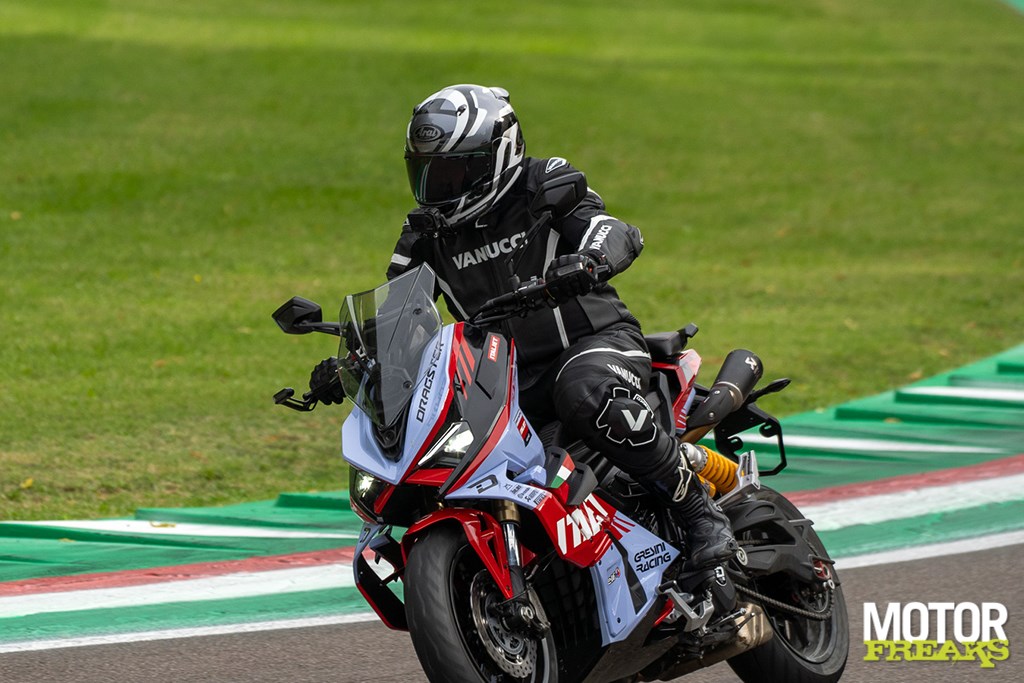 Na een uitgebreide introductie bovenaan de tribune op het rechte stuk – inclusief een spectaculaire demo van Gresini Moto2-rijders Albert Arenas en Darryn Binder – mochten wij zelf het circuit op. Drie rondes op het 4,9 km lange Imola zijn natuurlijk veel te weinig om een compleet oordeel te vellen, maar wel voldoende voor een eerste indruk. En om maar met de