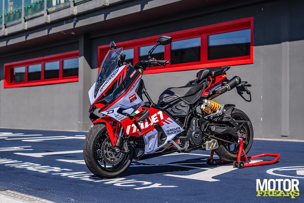 Wat wel direct duidelijk is: het design is onmiskenbaar Dragster. Agressief, compromisloos en opgebouwd uit componenten die je normaal gesproken eerder in de racerij verwacht. Denk aan een Marzocchi USD-voorvork, Öhlins-achterschokdemper en stuurdemper (alleen op de Limited), Brembo-remmen, Pirelli banden en natuurlijk de opvallende Akrapovic-dempers die de 692cc paralleltwin