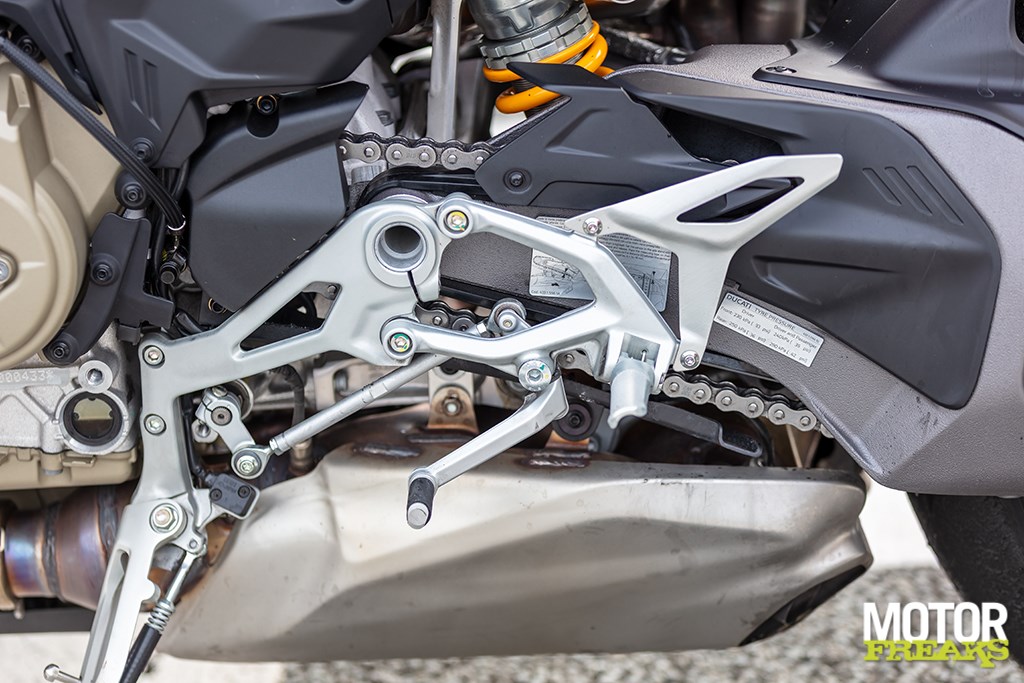 Onder dat blok hangt een volledig nieuwe dubbelzijdige “Hollow Symmetrical Swingarm”, geïnspireerd op de Panigale V4 R. Die is 43 % minder lateraal stijf dan de vorige enkelzijdige variant, maar wel lichter, en dat voel je. De achterkant werkt levendiger, geeft meer gevoel bij accelereren uit bocht 4 of bij het corrigeren over de hobbelige apex van de chicane.