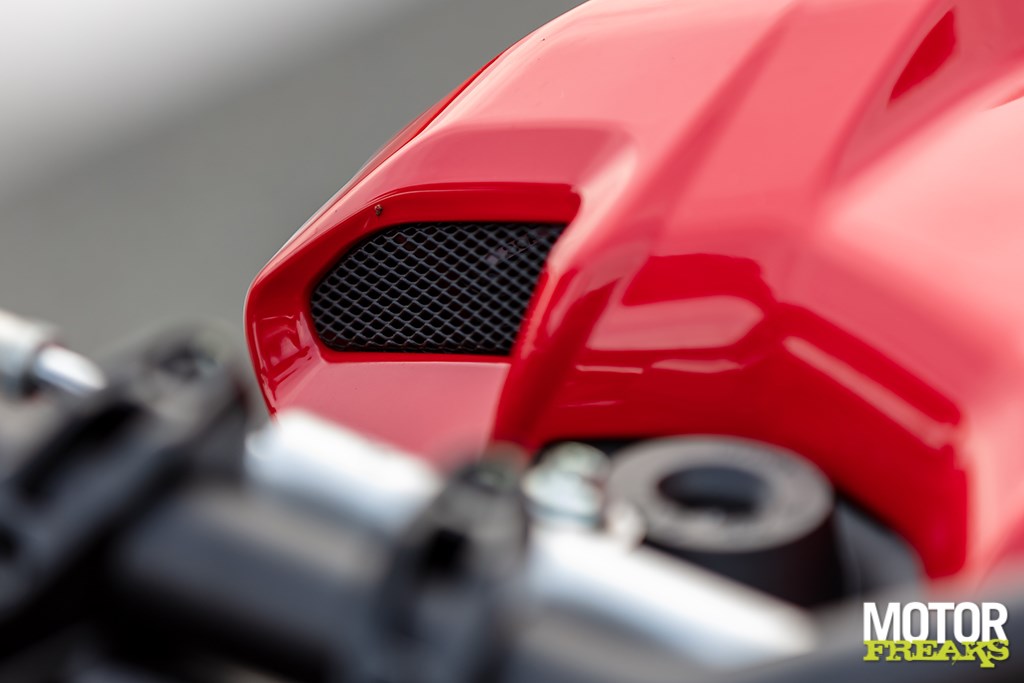 De tank en zadelunit zijn ruimer; je hebt meer bewegingsvrijheid voor- en achterwaarts, en de knieën vinden makkelijker houvast bij remmen. De twee luchtgeleiders in de zijpanelen voeren warme lucht weg van je benen — eindelijk. De zitpositie is nog steeds voorover, maar niet meer pijnlijk agressief.